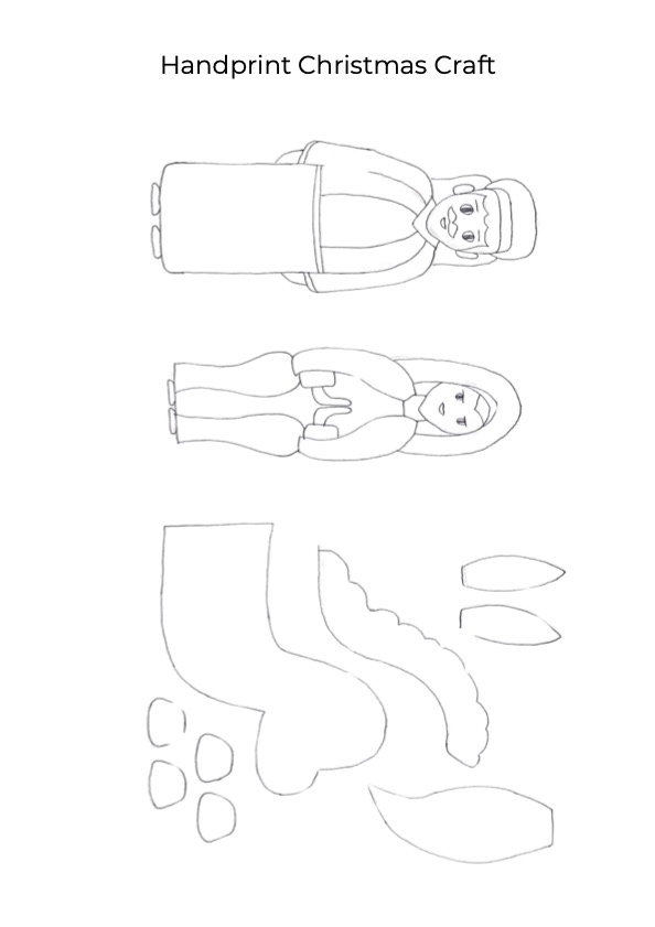Glue your finished handprint donkey onto a sheet of paper then glue Mary to the back of the donkey and Joseph near the donkey’s head. You can use a small piece of yarn to make it look like Joseph is leading the donkey, just glue it near the donkey’s face and Joseph’s hand.